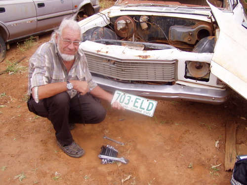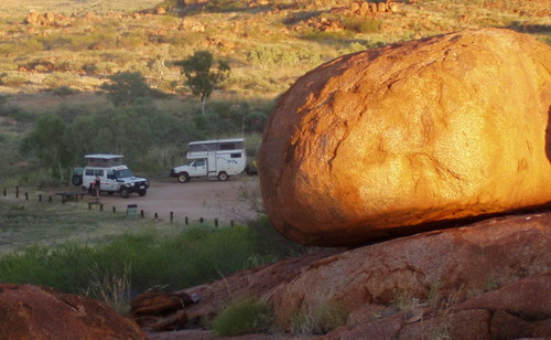 Dieser Riesenklotz in einer sonst ganz ebenen Landschaft für die Aborigines die versteinerte Regenbogenschlange. Isabella ist ein Teil des Felsens abgelaufen, da ich zu diesem Zeitpunkt nur mit Stock laufen konnte, hatte ich eine gute Ausrede mich vor größeren Laufexpeditionen zu drücken. Aufstieg war gesperrt, so das mir auch das erspart blieb, wir wären da aber sowieso nicht hoch. Gegen Abend anderen Toyota mit schwarz-rot-goldener Fahne im Heck getroffen, Verabredung 80 km weiter an der Tankstelle mit Free Camping zum Quatschen. In Australien ganz normal mal kurz 80 km, nur so! Bei Wein dann bis 23.00 Uhr gesessen. 16.04. 2 Nächte in Alice Springs, heute endlich Ölwechsel und neue Reifen am Hintern. Alkoholpreise: 2 Ltr. Wein 15 $ bisher 4 Ltr. für 10$ alles andere entsprechend. |