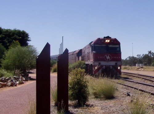 3 Tage später haben wir den Ghan auf dem Weg nach Adelaide beim Verlassen des Bahnhofs Alice Springs erwischt. Er hat hier immer über 4 Stunden Aufenthalt. Viele steigen hier erst mal aus und fahren 3 Tage später wieder mit dem nächsten Zug weiter. |