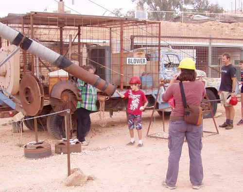 Besonders toll die Vorführung des Blower. Der Blower saugt den Abraum, des Baggers nach oben. Da ist einigen an Kraft erforderlich um Steine und Sand aus den Gruben bis zu 10 m nach oben zu befördern. Dies wurde hier demonstriert. Der Sog ist dermaßen stark, das der Junge im roten T-Shirt als er mit beiden Händen einen Stein in den Blower hält, vom Sog dermaßen angezogen wird ,dass er am Rohr hängt, wo er vom Vorführer, unter allgemeinen Gelächter, langsam wieder befreit wurde. |