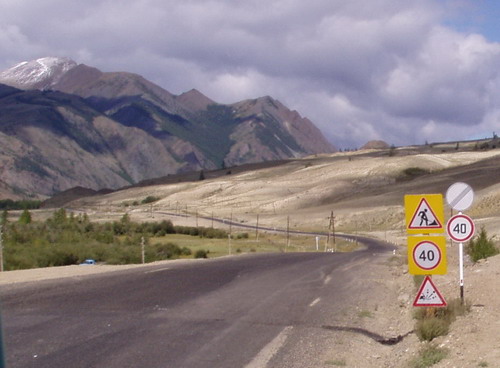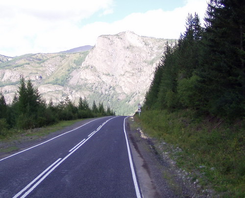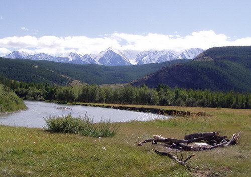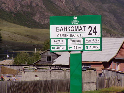 Russ. Altaigebirge, eine Wonne nach nur Sand und Steine. Übernachtungsplatz, da liegt schon das Feuerholz, die Bank zum Aussuchen, hier kann ich wieder soviel Geld ziehen, wie ich brauche und nicht wie in der Mongolei, für Wochen im Voraus denken. |