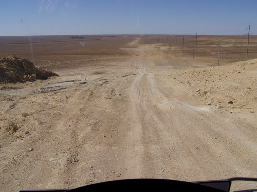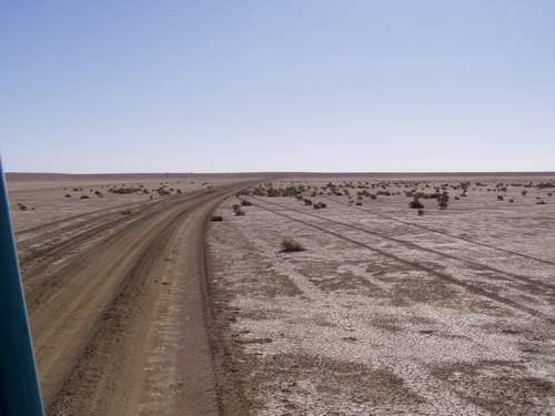 So in der Landkarte eingezeichnet, ( von XXX – XXX )grobe Schotterpiste, welch Wunder nach 5 km tolle Teerstraße, nagelneu, eine Baumaschine steht quer zur Straße, was soll den das? Wir kurven drum rum OK, nach 5 Km einer mit einem Fotoapparat und macht Foto von uns. Ohhh! Wir scheinen durch eine Baustelle zu fahren. 2 Km weiter wieder Schotterwellblech, durch eine Müllhalde durch, danach Sandwellblech. Bis zu dieser Kleinen Station an der Bahn sind wir gekommen, danach riesiges Sandfeld, kein Durchkommen mehr möglich, zumindest keine Fahrspuren erkennbar. |