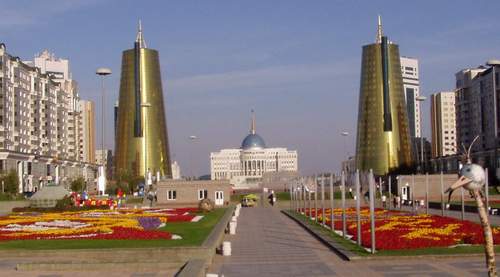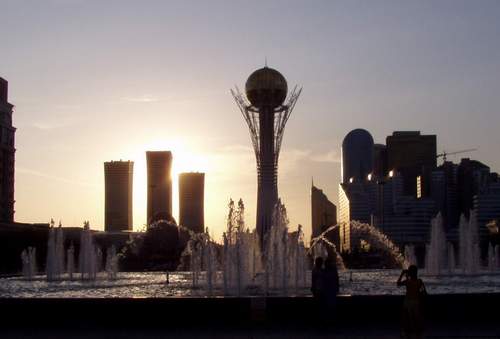 | Abends dann noch einen Rundgang. Isabella wollte die Stadt noch von oben sehen und ist mit dem Fahrstuhl hochgesaust. Astana von oben mit Blick auf den Präsidentenpalast und Regierungsgebäude. Dann das Foto aus der Erdperspektive mit 2 Goldtürmen und Blumen und Springbrunnen und, und, und. Man hat noch viel vor, bisher schon sehenswert, da wurden Architekten mit Ideen beschäftigt. Erinnert viel an Brasilia, auch eine Hauptstadt aus dem Boden gestampft. |