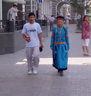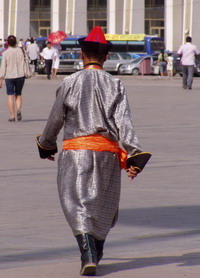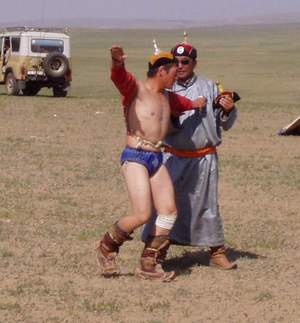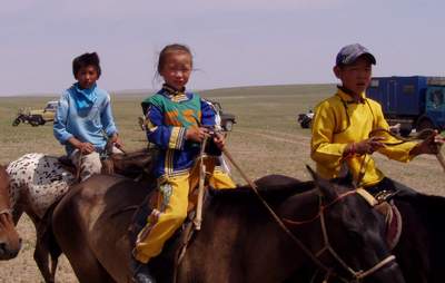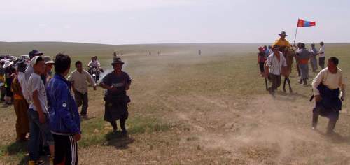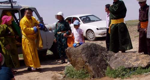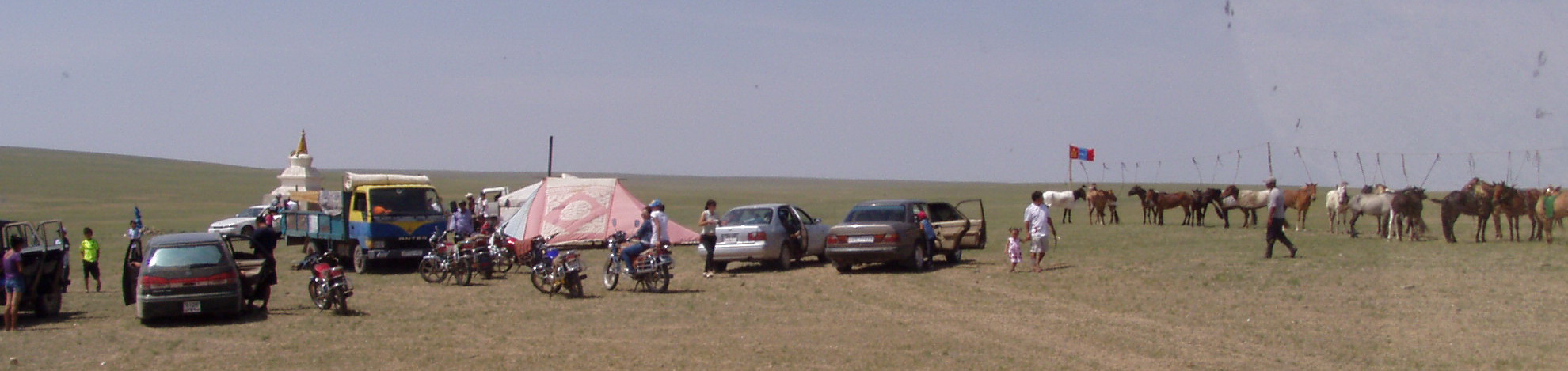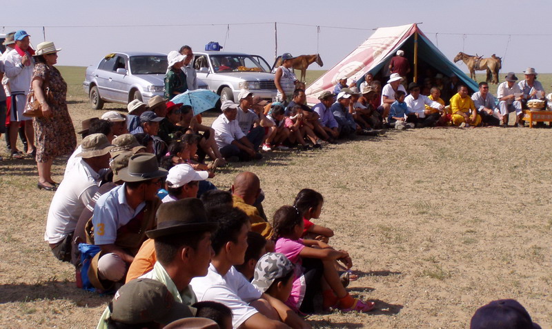 | Er erklärte uns, er heiße Ulsbold und sein Großvater, der dieses Fest veranstaltet, hatte ihn gebeten, uns mit Informationen zu versorgen. Das Foto zeigt Ihn zusammen mit seinem Großvater. Er ginge auf eine russische Schule in Ulaanbaatar. So blieben wir und verfolgten den Verlauf eines kleinen Nadaam, so heißen diese Feste. Zur Zeit war man dabei für Regen zu beten. |