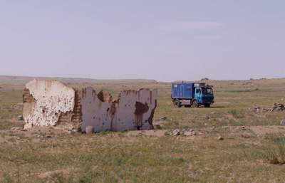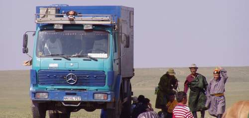 Erst mal 37 Km teilweise sehr schräge Bergpiste überwinden, mit unserer Kiste und dem wackeligen Aufbau teilweise ein Problem. Nach einigen verdammt schrägen Schräglagen, gab es nur noch die Alternative immer die unterste Piste benützen, egal wie diese aussieht. Ich sollte mich im Laufe der Mongoleitour noch an so manche schräge und senkrecht abfallende Pisten gewöhnen. Fahrwege werden nicht wie bei und am Hang angelegt also der Hang etwas abgegraben, damit ein gerader Weg entsteht, nein hier wird einfach auf dem schrägen Hang gefahren. |
