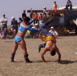 | Zu einem großen Kreis haben sich alle niedergelassen, es sind große Schüsseln mit gekochtem Fleisch herumgereicht worden, genau die erforderliche Stärkung um jetzt die Erwachsenen beim Ringkampf zu bewundern. |