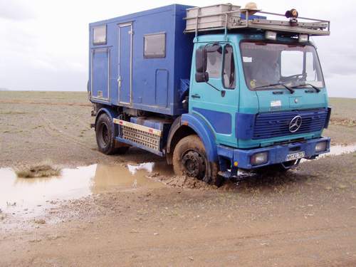 Vor Dalandzadgad sahen wir schon in einiger Entfernung ein in Schlamm eingesunkener Kleinbus, sowie ein Motorradfahrer, der ebenfalls Probleme hatte. Ein 4x4 PKW stand auch, ob eingesunken oder nicht, war nicht ersichtlich. An den Telegrafenleitungen waren auch einige Lieferwagen am rangieren. Vorsichtig versuchten wir unseren Weg zu finden. Dann sahen wir ein Fahrzeug an den Hügeln entlang Fahren, so auf halber Höhe, klar das war der Weg, 5 km retour und die andere Piste genommen. Doch auch da tiefe Schlammlöcher, bis auf eine Ecke kamen wir aber ohne große Schipparbeit durch. |