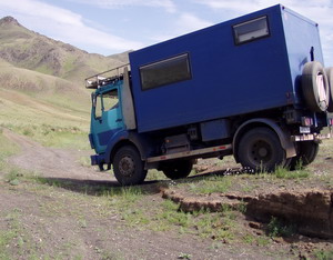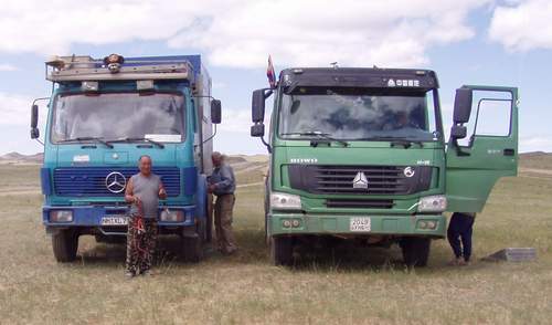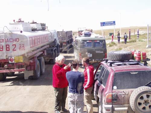 Mo. 16.08. Am Morgen noch schnell Dieselfilterwechsel, gestern ist unsere Kiste nur noch mit Mühe einen kleinen Berg hoch gekommen. Isabella musste das Fahrerhaus hoch wuchten, den Filter zu wechseln brachte ich gerade noch fertig. 1 Stunde Arbeit und ½ Stunde später waren wir an der mongolischen Grenze. 1 ½ Stunden Abfertigung, weiter zur Russischen Grenze. |