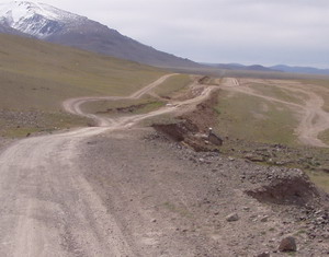 | Erst über einen kleinen Hügel, danach entweder einen steilen Berg senkrecht 30 bis 40 m nach oben oder aber an den Bergen entlang. Entscheidung, wir bleiben unten. Nach ca. 2-3 Km. Nur noch Berg und Talbahn, 10 – 15 m abwärts und 10 m durchs trockene Geröllbett, danach die 15 m wieder nach oben. Nachdem kein Ende dieser Geröllbetten abzusehen war, Entscheidung, wir fahren einfach so ein Geröllbett wieder abwärts ins Tal, da müsste ja die andere Piste laufen. | ![]() |