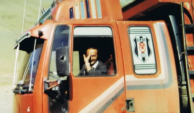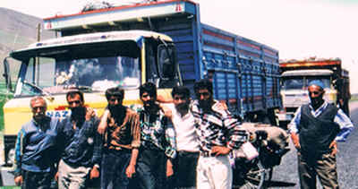 Den Ararat hoch in der Mittagssonne, er stoppte und band ein Seil an den LKW und zog mich ganz langsam die Straße hinauf. Oben warteten die Kollegen, 4 andere LKW, er war der letzte, sie hatten ihn schon vermisst. Klar! alle waren mit dem Stopp einverstanden und wollten natürlich auch alle aufs Foto. |