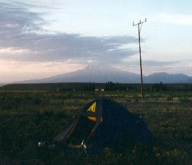 Horosan, Kagisman, Tuzluca, Igdir, am Ararat vorbei nach Dogubayazit Die ganze Strecke, füllt mehrere Seiten in meinem Tagebuch, ich muss mich also etwas be- schränken.Teilweise wunderschöne Strecke, auch ganz gut zu befahren, auch wenn ein LKW der einen anderen überholen wollte so plötzlich auf meine Fahrbahn ausschwenkte, dass ich nur mit Mühe und Vollbremsung auf den Schotterstreifen ausweichen konnte und nur knapp einem Sturz, den Abhang hinunter entging. Gottseidank war dies auch der einzige wirklich kritische Fall während der ganzen Reise.Viele Einladungen, wobei mir der Türke besonders in Erinnerung ist, der, als ich ihm von meiner Reise erzähle, prompt fragt: " Du nix Arbeit". Mehrmals stellte sich auf dieser Strecke das Problem Militär, wenn ich einen Übernachtungs platz suchte. Die sonst so gastfreundlichen Kurden und Türken, hatten Angst, so daß meine Frage nach Zelten in der Nähe oft abgelehnt wird.