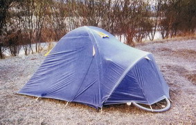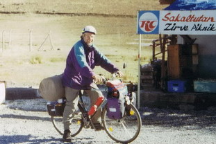 Zwei Tage später bin ich wieder auf Platzsuche. Links ein Feldweg, nach 150 m ein ebenes Plätzchen. Ich baue auf. Plötzlich entdecke ich , dass genau unter einer Hochspannungsleitung stehe, nicht gerade der beste Ort, bei Blitz und Donner, so packe ich das Zelt und ziehe 100 Meter weiter. Das Rad bleibt vorerst stehen, da ich durch einen Acker und eine neugepflanzte Schonung muss. Zeltaufbau, Rad holen und zurück Rabenschwarze Nacht, ich kann mein Zelt nicht mehr finden. Zwischenzeitlich kommt ein Auto mit aufgeblendeten Scheinwerfern, und kurvt genau auf dem Platz rum, an dem ich vorher mein Zelt stehen hatte, Militär ? Forst ? Er ist sichtlich auf der Suche nach mir, kann aber genau wie ich das Zelt nicht entdecken. Nach 20 Minuten fährt er zurück in einen, jetzt durch zwei Scheinwerfer angestrahlten Bau. Nun sehe ich auch mein Zelt, es stand keine 20 Meter eben mir. Es ist kalt und unruhig in der Nacht. Ich hatte das Zelt genau über den Eingang eines Maulwurfbaues, oder von Feldmäusen gestellt. Die Ganze Nacht waren die Tierchen dabei Futter in Ihren Bau zu verfrachten. Auf den Boden klopfen bewirkte nur für Minuten eine Unterbrechung ihrer Tätigkeit. Am Morgen war ich bereits um 6.30 auf der Straße, in der Hoffnung dem gestrigen Suchtrupp zu entkommen. Sporthotel steht auf dem Zufahrtschild. Wollten die mich wegen der Kälte wohl ins Hotel holen ? Nach 11 Km erreiche ich den Sakultutan Pass mit 2160 m. Kein Wunder das mein Zelt vereist war. Die Teebude geschlossen, ich konnte ja selbst Cafe kochen. Von dem Militärlager auf der Passhöhe, gesellte sich ein Aufpasser dazu, der noch zwei Minikuchen beisteuert. |
