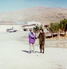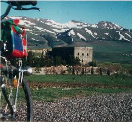 In Dogubayazit nächtige ich im Hotel. In einem anderen Hotel wohnen Tulli Williams und Steven Chaffer, ebenfalls Radler aus Australien. Freundliche Mitmenschen sorgten dafür dass wir uns kennen lernen. Beide waren von England per Schiff nach Portugal, Spanien, Italien, mit Fähre Griechenland und weiter nach Izmir, per Rad bis Sivas. Dort hatte man ihnen von einer Weiterfahrt abgeraten, daher bis hier her mit dem Bus. Leider hatten sie unterwegs eine unangenehme Zeltnacht. Mit Knüppeln hatten ein par Betrunkene auf das Zelt eingeschlagen und sie aus dem Zelt getrieben, danach fehlten Fahrradtasche und sämtliche Scheckkarten. Bargeld war nicht verschwunden. Da sie für den Iran nur Transitvisa haben, werden sie nur bis Tehran radeln, und dann mit dem Bus weiterreisen. | ![]() |