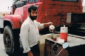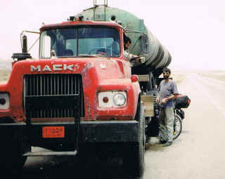 Immer wieder wollen mich LKW Fahrer zum Tee einladen, na ja beim Nächsten nehme ich die Einladung an.5 Minuten später ausgerechnet ein Mack, diese Sch-dinger, (Isabella meinte ich solle mich doch etwas gewählter ausdrücken), die scheinbar nur sehr schwer zu lenken sind und einem immer wieder mit lautem Gehupe in den Schotter befördern. Dieser, Baujahr 56, hatte auch genauso alte Reifen, bei einem schimmerte schon der Schlauch durch, der ist finish! Aussage des Fahrer, rauf auf den Bock und mit 60 Sachen in Richtung Bam. | ![]() |