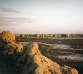 | Doch von wegen Wüste, Kilometer und Kilometer an fruchtbaren Plantagen vorbei, Palmen, Palmen, Palmen. Riesige Lehmbrocken, verteilt, im Gelände. Abendsonne, Fotos von diesem kaum beachteten Naturwunder, und weil`s so schön ruhig, bleibe ich gleich über Nacht. Nach Fahreg ging`s dann wirklich in die Wüste |