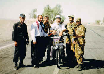 . Danach, Melone, von vierköpfiger Nissan Besatzung, Tee vom LKW, von einem anderen wurde mir etwas für herrliche Träume geboten, das war dann auf jeden Fall der Zeitpunkt weiter zu radeln, die im LKW machten es sich erst mal bequem. Passportkontrolle, der Chef kommt gerannt er will ein Foto von mir, OK im Gegenzug will ich auch ein Foto . Auf dem Foto ist sogar sein Apparat zu sehen. Mit dem Pass können Sie allerdings nicht viel anfangen. Ein paar mal wird hin und her geblättert, danach die Frage: "Swisse?" |