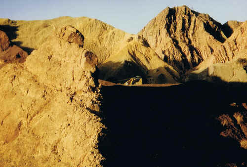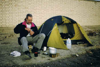 | Nur schemenhaft kann ich die schwarzen, rollenden Reifen neben mir erkennen. Nur ganz schwach die weiße Linie neben mir verfolgen. Endlich Tageslicht, oder besser Abendlicht, fantastische Bilder, ich kralle mich fest, Kreuzweh, das geht vorüber, der Arm wird immer länger, ich lasse nicht los. Endlich oben, 40 km war ich im Schlepp gewesen über 1 Stunde. Ohne diese Hilfe?? Zelt zwischen die Felsen geklemmt und dann musste eine eiserne Ration Bundeswehr dran glauben. Die letzte Nacht im Zelt. |