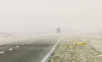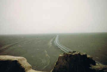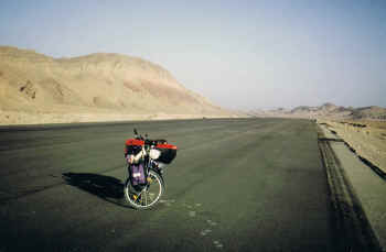 | 35.o Grad meine Geschwindigkeit pendelt so um 10 kmh. Neben mir stoppt ein Landy, ich bekomme Wasser, ganz kalt und eine Orange. Weiter gegen Wind und Sand. Wüste pur, kein Busch, kein Baum, kein Grashalm oder mal ne alte Mauer, die etwas Schatten spenden würde. Da endlich in weiter Ferne ein Turm. Mittagspause, meine gekochten Eier, haben kaum von der Schale befreit, haben diese eine neue aus feinstem Sand, auch die Gurkenscheiben haben sofort ein sandiges Aussehen. |