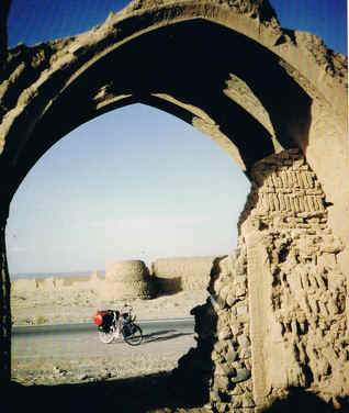 Wäsche waschen in einem Bewässerungsgraben, alte Karawansereien oder der tolle Bergort Tarq, in dessen Ruinen ich mehrer Stunden verbracht habe. Doch davor war ich fast am aufgeben. Starker, stürmischer Wind bei bergansteigender Strecke, der Hund der mich mit den Straßenschotter bekannt machte. 23 Km in drei Stunden, meine Kraft ist am Ende, meine Moral auch. Zwei Möglichkeiten, zurück und den Abstecher nach Esfahan streichen, oder ab Esfahan mit dem Zug weiter, sonst schaffe ich die Strecke nicht, mein Rückflug ist für den 16.05 gebucht. Das ist wirklich der Nachteil, bei dieser Etappentour, das man zu einen bestimmten Zeitpunkt am Zielort sein muss. Ein langsamer Schwertransporter enthob mich dann der Entscheidung. Nur 5 Minuten ziehen, aber ich war wieder auf Strecke 2 1/2 Stunden verbrachte ich auf der Polizeistation an der Straßenkreuzung nach Esfahan. Abendessen am Schreibtisch des Oberhauptmanns und natürlich mein kleines Bilderalbum. Das Türkenmädchen, ohne Kopftuch, nach und nach kam die ganze Station, jeder wollte es sehen. ( Siehe Bericht Belgrad- Istanbul. ) An der Polizeistationsmauer schlage ich mein Zelt auf. |