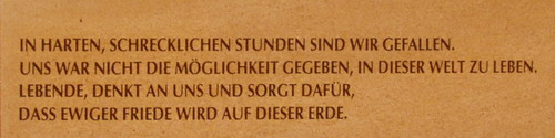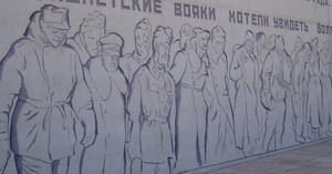 Außen an der Mauer eine Zeichnung der deutschen Soldaten bei der Gefangennahme, von 90 000 kamen 6000 zurück. Ich kann mich noch erinnern, nach dem Besuch Adenauers in Russland, als die Züge mit den Heimkehrern kamen, der Aufschrei in Deutschland, ist das Alles!