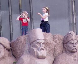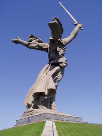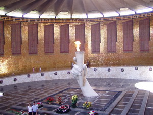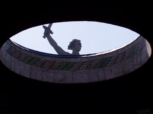 | Russische Gedenkstätten haben immer etwas Gigantisches. Die Größe der Figur kann man erst erkennen, wenn man auf dem Foto die Frau mit dem Kinderwagen entdeckt hat, in der Mitte des Sockels. Die riesige Figur, macht vom Gesicht her nicht einen sehr glücklichen oder siegesfreudigen Eindruck, klar, denn sie kann in die Gedenkstädte der gefallenen russischen Soldaten hineinsehen, Zig Fahnen mit den einzelnen Namen sind an den Wänden mit Mosaiksteinen verewigt. |