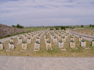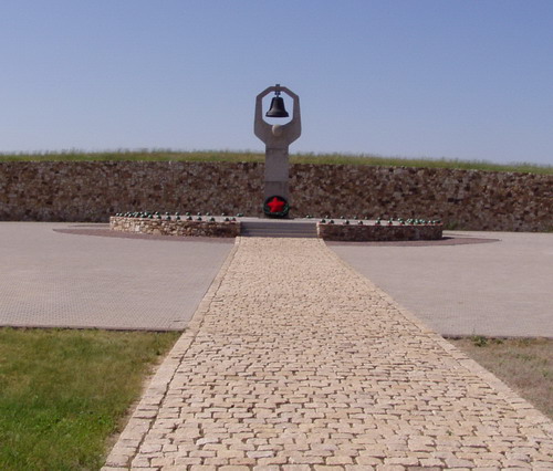 Gegenüber der Friedhof der russischen Soldaten, mit einem Weg verbunden, auf jedem Grabstein der Stahlhelm des Beerdigten. | ![]() |