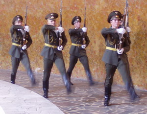 Ruhige Musik dazu( die Träumerei), ein beeindruckender Raum, einem Kind fällt seine Mütze klatschend in die Gedenkstätte hinunter, ruhig, Pause, es dauert einige Sekunden bis die Leute sich wieder bewegen, dann klatsch, klatsch, klatsch, im übertriebenen Stechschritt erfolgt die Wachablösung. 2 der Soldaten sind im Baedecker Reiseführer bereits abgebildet. |